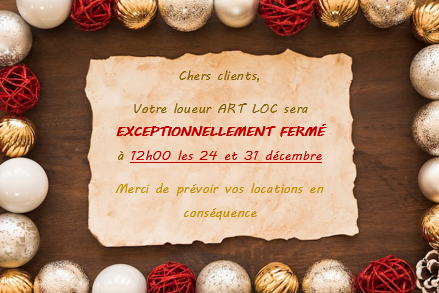Nous serons fermés le 31/12 à 12h00 et nous réouvrirons le 05/01/2026 à 7h00